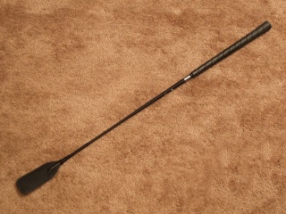 A riding crop is a short, rigid whip without tails or a lash. Typically less than a metre in length, it is made of fibreglass or cane, and is covered with braided leather, plastic or other material. The business end of the crop will usually finish with a leather loop or flap to limit how much pain and damage it can cause.